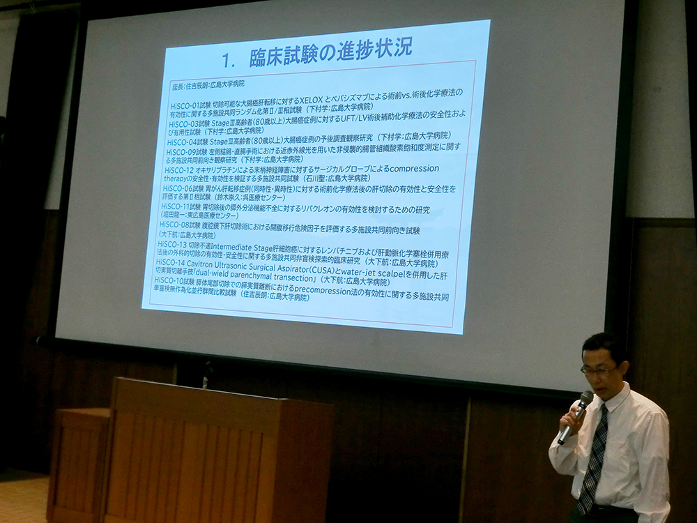 | 臨床試験報告: | 1. HiSCO-01試験:広島大学消化器外科 小林 剛 先生 2. HiSCO-03/04試験:県立広島病院消化器外科 池田 聡 先生 3. HiSCO-05試験:広島大学消化器外科 黒田 慎太郎 先生 4. HiSCO-06試験:呉医療センター消化器外科 鈴木 崇久 先生 5. HiSCO-07試験:広島大学消化器外科 近藤 成 先生 6. 共通データベース 1) 肝臓がん:広島大学消化器外科 濱岡 道則 先生 2) 大腸がん:県立広島病院消化器外科 安達 智洋 先生 3) 胃がん:広島大学病院消化器外科 堀田 龍一 先生 7. 新規臨床試験案 1) 胆道再建後のDICと胆道感染症 リコモデュリン試験:広島大学消化器外科 大平 真裕 先生 |
