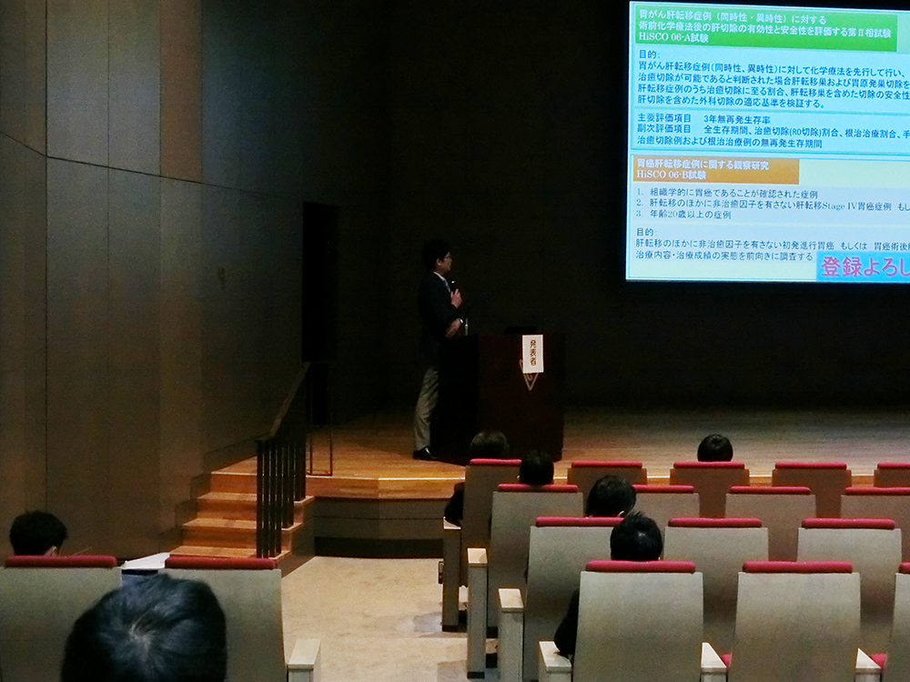 | 事務局レポート: | 平成25年度定期総会の後、中外製薬との共催でHiSCO Meetingを行いました。事務局からはHiSCO-01試験ならびにHiSCO-02試験の進捗状況の報告に加え、HiSCO-MCFG試験の開始や臓器別ワーキンググループの立ち上げについて報告いたしました。そして大毛宏喜先生に外科領域の深在性真菌症におけるミカファンギンの有用性に関する多施設共同研究として、HiSCO-MCFG試験の立ち上げならびに利益相反に関しNPO法人を利用した医師主導研究を行うことによる透明性の確保についてご説明いただきました。 特別講演では、東京医科歯科大学応用腫瘍学講座準教授植竹宏之先生に大腸癌肝転移治療の新たな知見について御講演いただきました。ASCO 2012-2013での新たなエビデンスとして、TMLセカンドライン治療でのアバスチン®継続使用(BBP; Bevacizumab beyond PD)の有用性についてわかりやすく解説していただき、また大腸癌肝転移の腫瘍の大きさや腫瘍数に応じた抗体薬の使い分けについて御講演いただきました。 |